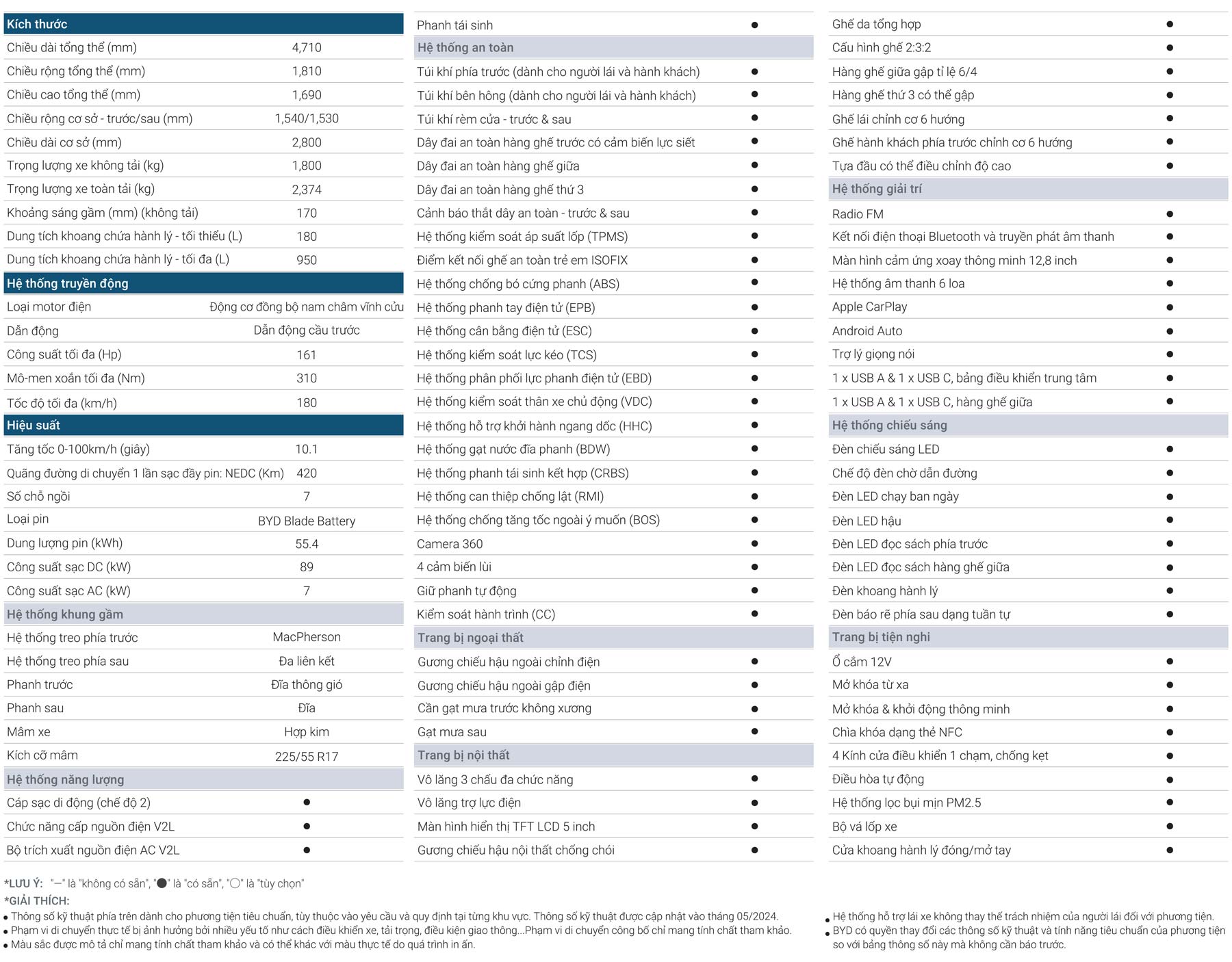 BYD M6 sử dụng động cơ điện với công suất 161 mã lực, mô-men xoắn cực đại 310 Nm – mạnh mẽ nhất phân khúc nhưng vẫn đảm bảo khả năng tiết kiệm nhiên liệu ấn tượng. Cung cấp năng lượng cho xe là bộ pin Blade dung lượng 55,4 kWh, phạm vi di chuyển tối đa sau một lần sạc đầy là 420 km theo tiêu chuẩn NEDC. Đặc biệt, người dùng có thể biến chiếc xe thành bộ sạc di động với tính năng V2L, cung cấp nguồn điện 220V cho các thiết bị dân dụng như quạt, đèn, TV, máy lạnh…